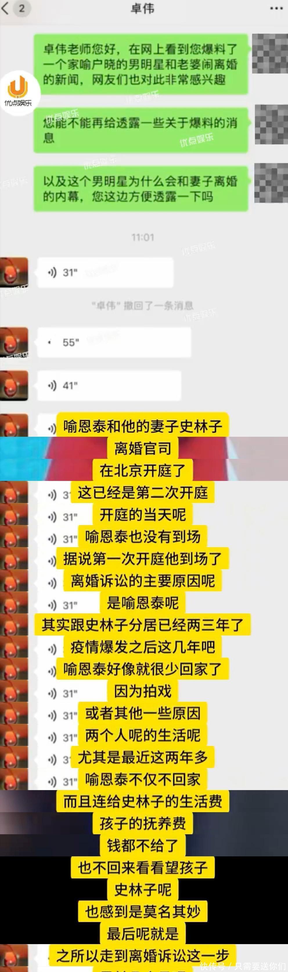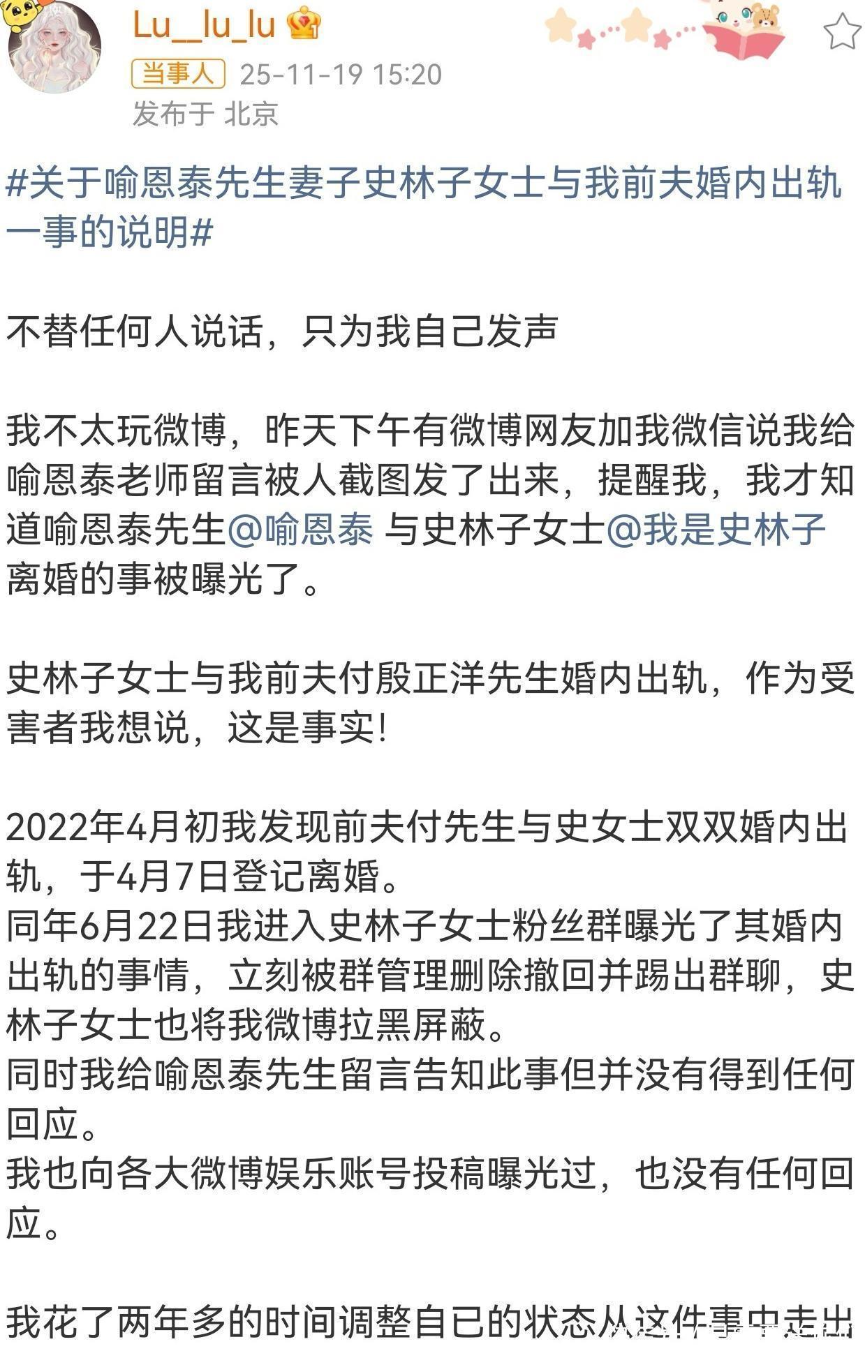 该女子声称,自己通过行车记录仪发现证据后,果断离婚,还多次尝试曝光他们。她进入过史林子的粉丝群,但被管理员删除撤回并踢出群聊;她也曾跑到喻恩泰微博下留言提醒,但没有得到任何回应;她还向各大娱乐账号投稿曝光过,但同样没得到回应。如今她再度发声,有图有真相,证实史林子确实插足过自己婚姻,但强调不为任何人说话,只为自己发声。